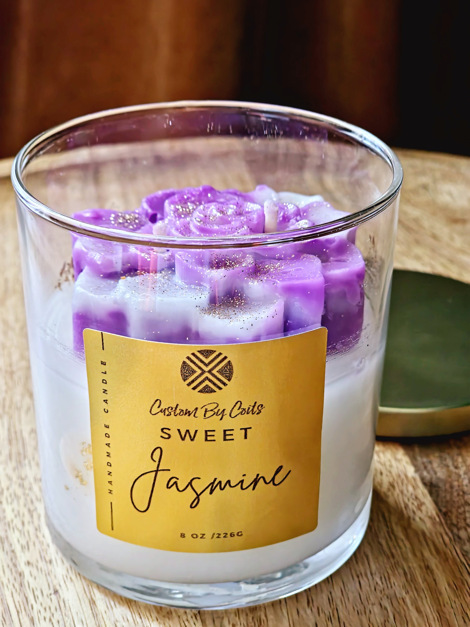 Custom By Coits' Sweet Jasmine Candle features a lovely floral design with a sweet jasmine scent. This 8 oz hand-poured candle comes packaged in an elegant gift box, perfect for candle lovers.